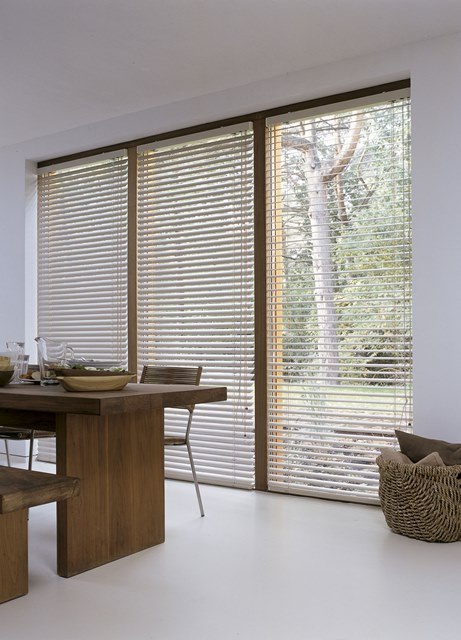 Na velké skleněné plochy oken nebo prosklená průčelí se skvěle hodí klasické horizontální žaluzie ve všech uvedených typech. Možné je použít také panelové stěny a plisé žaluzie. Látky či jednotlivé panely, jsou často snadno snímatelné a pratelné.